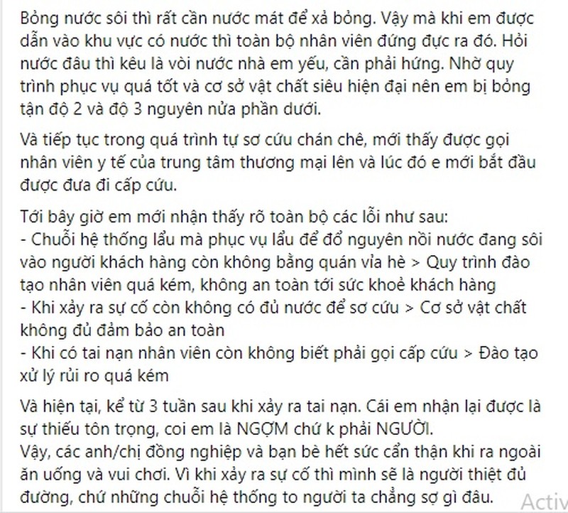 "Nhờ quy trình phục vụ quá tốt và cơ sở vật chất siêu hiện đại nên em bị bỏng tận độ 2 và độ 3 nguyên nửa phần dưới. Và tiếp tục trong quá trình tự sơ cứu chán chê, mới thấy được gọi nhân viên y tế của trung tâm thương mại lên và lúc đó e mới bắt đầu được đưa đi cấp cứu", vị khách hàng bức xúc.