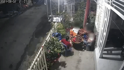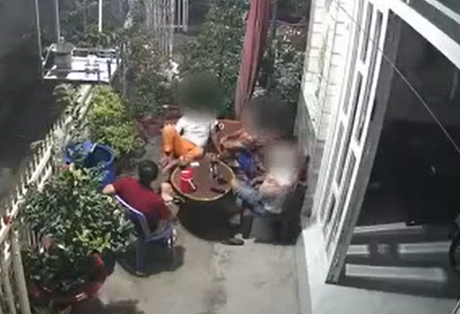 Theo đó, tại sân nhà của một hộ gia đình có 4 người đàn ông tụ tập, không đeo khẩu trang đang ngồi nói chuyện, cười đùa. Quá trình nói chuyện, 1 trong số 4 người nhanh mắt "tia" thấy tổ tuần tra, giám sát đang đi đến gần. Thấy vậy, người này nhanh chóng ra hiệu với 3 người còn lại để chạy trốn.