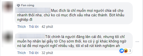 "Tôi chính là người đăng lên cái đó, nhưng tôi chỉ muốn họ nhận lại giấy tờ cho sớm thôi, không có ý gì khác. Tôi không ngờ nó lại để mọi người nghĩ nhiều vậy. Tôi xin lỗi, tôi sẽ rút kinh nghiệm ạ."