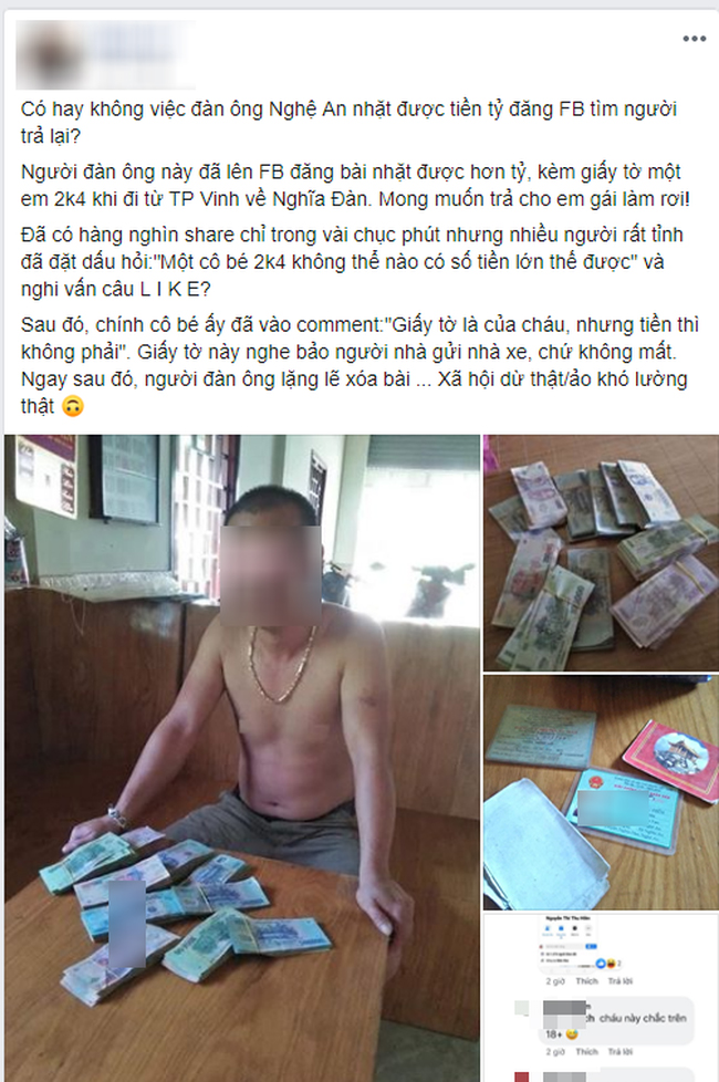 Mới đây một người đàn ông ở Nghệ An bị dân mạng lên án vì giả vờ nhặt được hơn 1 tỷ, đăng tải lên facebook để trả lại người mất.
