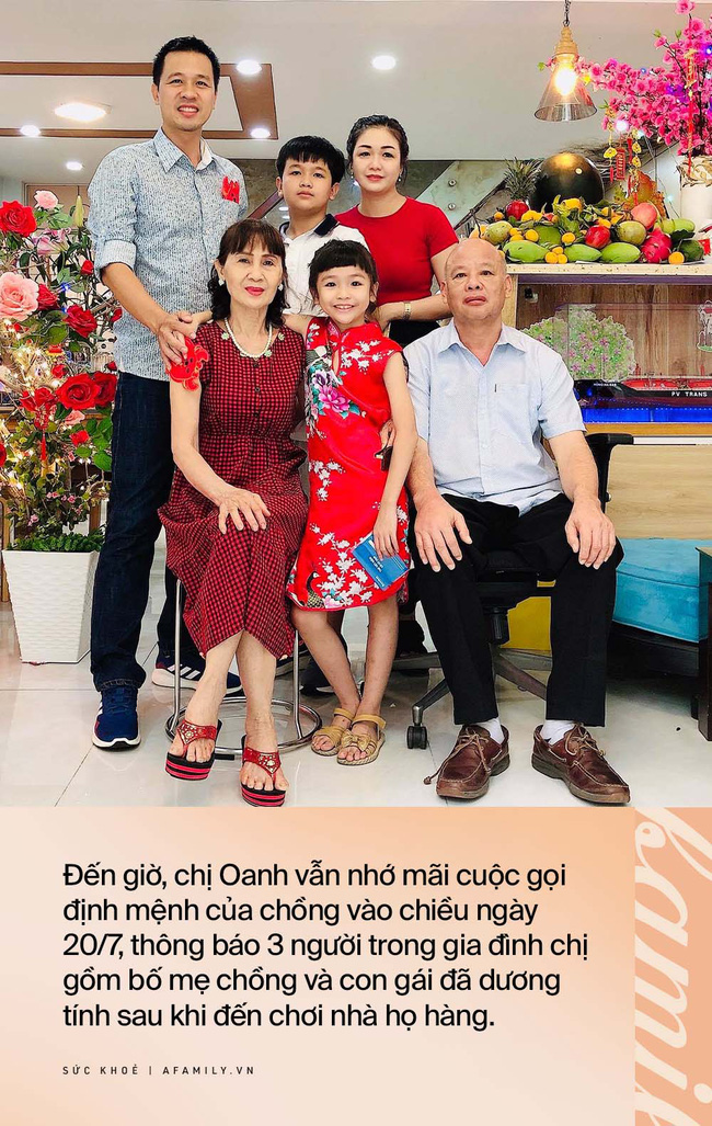 Đến giờ, chị Oanh vẫn nhớ mãi cuộc gọi định mệnh của chồng vào chiều ngày 20/7, thông báo 3 người trong gia đình chị gồm bố mẹ chồng và con gái đã dương tính sau khi đến chơi nhà họ hàng. Mất vài phút choáng váng, chị Oanh đã tự trấn an bản thân, trong đầu lúc này hiện ra một loạt các "dữ liệu vàng" cần được sắp xếp lại.
