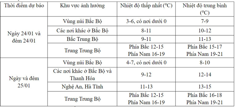 Cơ quan khí tượng cho biết, đợt rét đậm, rét hại diện rộng ở Bắc Bộ và Bắc Trung Bộ có thể kéo dài đến khoảng ngày 28/1. Vùng núi cao còn có khả năng xảy ra mưa tuyết và băng giá. Nhiệt độ thấp nhất ở Bắc Bộ phổ biến từ 8-10 độ, khu vực vùng núi Bắc Bộ từ 3-6 độ, vùng núi cao có nơi dưới 0 độ; khu vực Bắc Trung Bộ phổ biến từ 9-11 độ.
