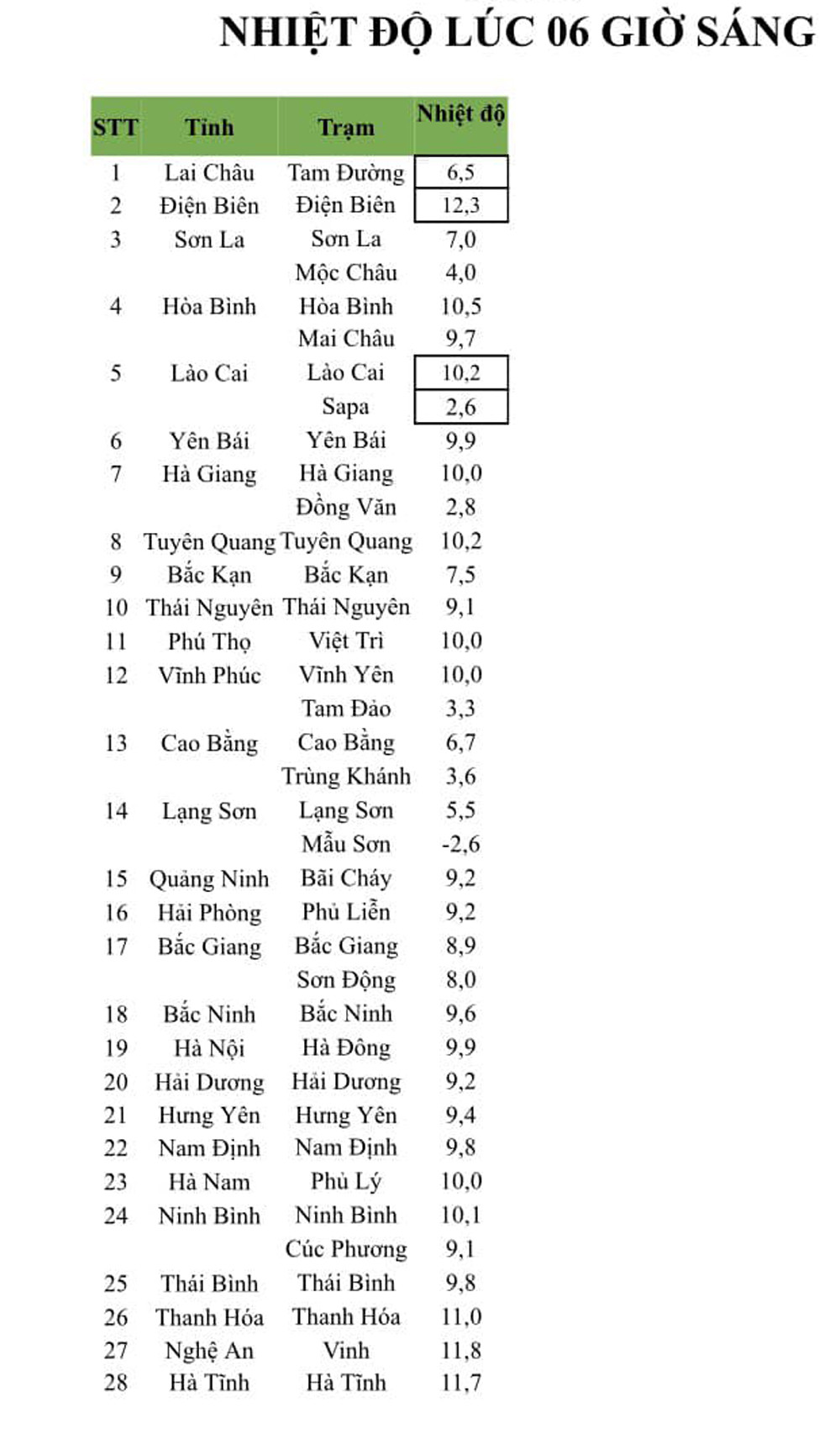 Nhiệt độ được cập nhật lúc 6h sáng nay, Mẫu Sơn (Lạng Sơn) -2,6 độ; một số nơi ở vùng núi quanh mức 1-4 độ như: Tam Đảo (Vĩnh Phúc) 3,3 độ; Đồng Văn (Hà Giang) 2,8 độ; Sa Pa (Lào Cai) 2,2 độ; Trùng Khánh (Cao Bằng) 3,6 độ; Mộc Châu (Sơn La) 4 độ.