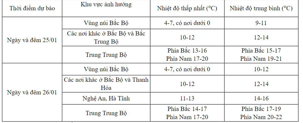 Cơ quan khí tượng cho biết, đợt rét đậm, rét hại diện rộng ở Bắc Bộ và Bắc Trung Bộ có thể kéo dài đến khoảng ngày 29/1. Vùng núi cao còn có khả năng xảy ra mưa tuyết và băng giá.