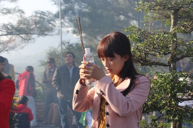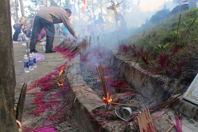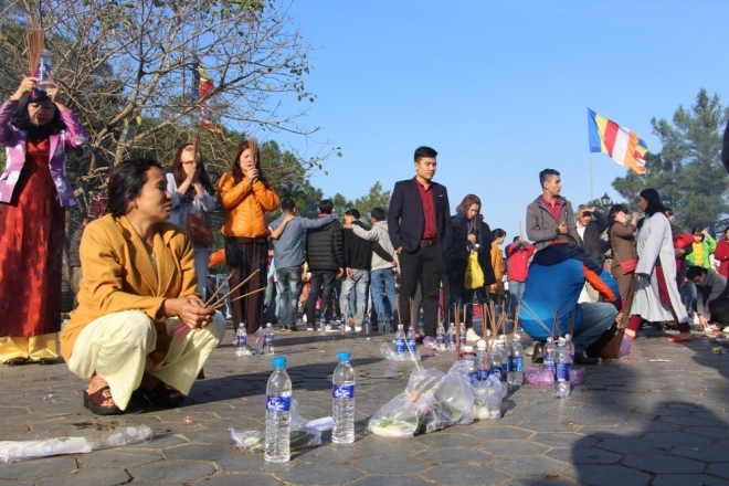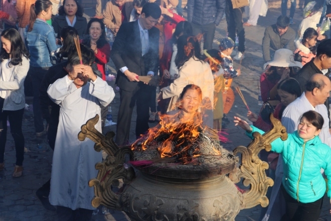 | Lượng người đổ đến quá đông khiến khu vực trước tượng Quan Thế Âm Bồ Tát chật kín, bát cắm hương bốc cháy ngùn ngụt. |