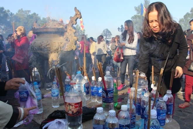 | Người dân gài hương vào những chai nước đặt trước hương án dẫn đến cảnh chai lọ nằm khắp sân chùa. |