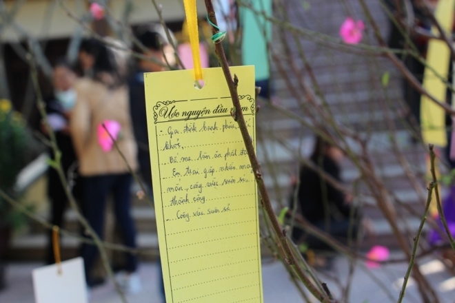 | Một số người dân khác chọn chùa gần thành phố Huế để cầu an. Sau khi xin xăm, người dân ghi ước nguyện năm mới vào mảnh giấy và treo ở cây đào trước sân chùa. |