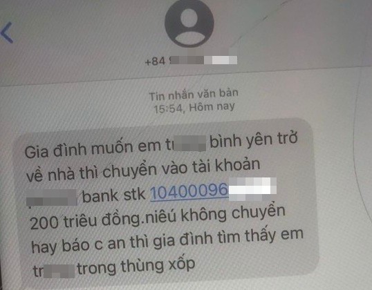 Sau khi tiếp nhận thông tin, Công an quận Hà Đông đã mời gia đình Tr. lên làm việc để xác minh làm rõ. Chiều 21/2, trong lúc đang làm việc với cơ quan công an, chị Đinh Thị T. (SN 1982, quê Thái Bình - là mẹ đẻ Tr.) nhận được tin nhắn từ số máy lạ với nội dung: “Gia đình muốn em Tr. bình yên trở về nhà thì chuyển vào tài khoản XXX 200 triệu đồng, nếu không chuyển hay báo công an thì gia đình tìm thấy em Tr. trong thùng xốp”.