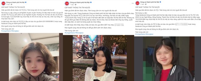 Điển hình, ngày 20/2, Công an thành phố Hà Nội thông báo tìm kiếm cô gái 19 tuổi, sinh sống trên địa bàn huyện Thường Tín, mất tích từ ngày mùng 3 Tết. Theo thông tin từ gia đình, chị Bàn Thị Th. rời nhà từ ngày 12/2 và mất liên lạc cũng từ thời điểm đó. Khi đi, chị Th. mặc áo màu nâu, chân váy trắng, đi xe máy Honda Lead màu xám. Sau khi cơ quan chức năng phát đi thông báo, đến tối cùng ngày, gia đình đã tìm thấy chị Th. ở tỉnh Thanh Hóa.