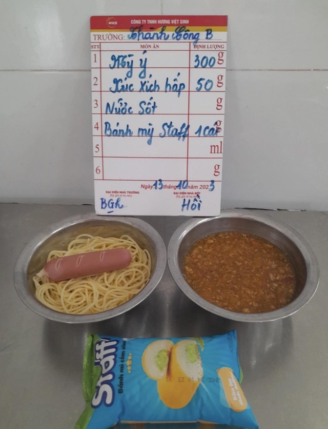 Phản ánh của phụ huynh, bữa trưa hôm đó, học sinh của nhà trường ăn mỳ ý kèm sốt và xúc xích, bữa phụ buổi chiều có bánh ngọt. Một số con không ăn bữa phụ và mang bánh ngọt về nhà cho thấy bánh vẫn còn hạn sử dụng.