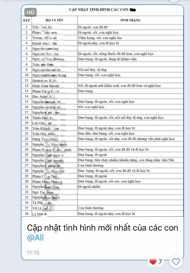 Trong lớp ghi nhận hơn 20 học sinh trong tình trạng tương tự. Những lớp khác cũng có học sinh bị đau bụng và sốt cao.