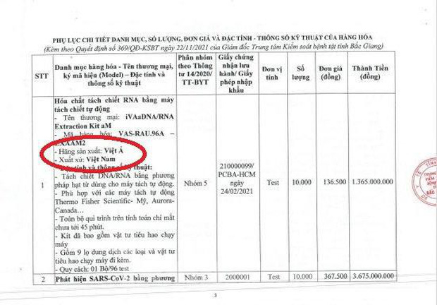 Đơn cử, ngày 24/9/2020, CDC Bắc Giang lựa chọn Công ty Cổ phần Dược Vật tư Y tế Phan Anh cung cấp trọn gói gói thầu "Mua sinh phẩm xét nghiệm phục vụ phòng chống dịch bệnh COVID-19 (lần 4 năm 2020)" cho CDC Bắc Giang. Hàng hóa là 60 bộ kit xét nghiệm bằng phương pháp RT-PCR do Công ty Việt Á sản xuất. Tổng giá trị gói thầu là 1,527 tỷ đồng (tương đương 25,462 triệu đồng/bộ).