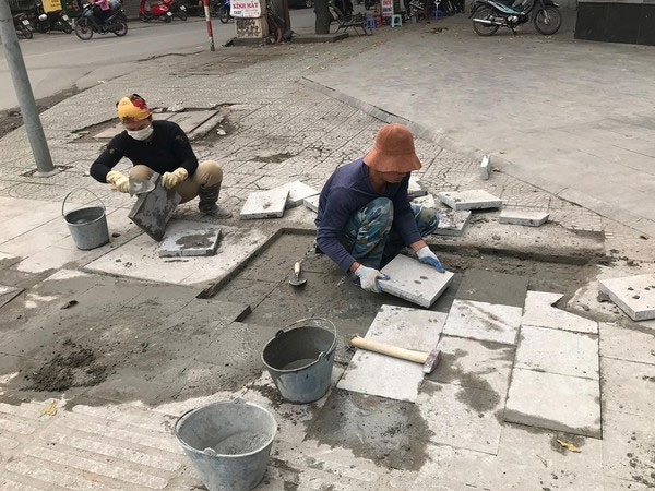 Theo ghi nhận của phóng viên Tiền Phong, hiện trên địa bàn thành phố, nhiều tuyến phố lát vỉa hè bằng đá tự nhiên thời điểm trước năm 2019 xuất hiện nhiều vị trí xuống cấp, hư hỏng nghiêm trọng. Một số tuyến hiện phải tiến hành sửa chữa, vá lại những vị trí hư hỏng. Cụ thể, trên tuyến phố “kiểu mẫu” Lê Trọng Tấn (Thanh Xuân), hàng loạt vị trí lát đá đã phải thay mới. Vỉa hè đường Nguyễn Trãi cũng hư hỏng nghiêm trọng. Nhiều chỗ đang được các công nhân tiến hành sửa chữa, thay mới đá, thậm chí cả những viên bó vỉa. Trên địa bàn quận Nam Từ Liêm, tuyến phố Trịnh Văn Bô cũng xuống cấp, nứt gãy nhiều vị trí, được vá lại bằng bê tông.