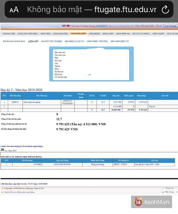 Cụ thể, trường ĐH Ngoại Thương luôn thông báo học phí qua trang tín chỉ FTUGATE. Trước kỳ thi 1 tháng, FTUGATE sẽ hiện số tiền sinh viên cần đóng dựa vào số tín trong kỳ đăng ký được. Tuy nhiên, trang này thường xuyên cập nhật thiếu dữ liệu khiến nhiều bạn dù đóng tiền đầy đủ nhưng vẫn hiện số dư hàng chục triệu đồng.
