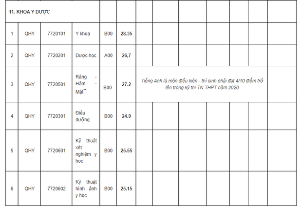Ngành Y khoa có điểm chuẩn cao nhất là 28,9 điểm. Xếp ngay sau đó là ngành Răng Hàm Mặt với 28,65 điểm.