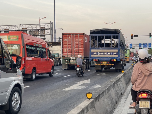Do làn xe máy ùn ứ nên một số người đi xe máy mạo hiểm di chuyển vào làn ôtô, vốn cũng không thông thoáng hơn là mấy. Tại khu vực gần các ngã tư R-MK, Bình Thái, Thủ Đức, không khó bắt gặp xe máy luồn lách cạnh ôtô, xe container để được đi nhanh hơn, bất chấp nguy hiểm.