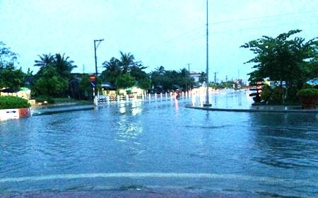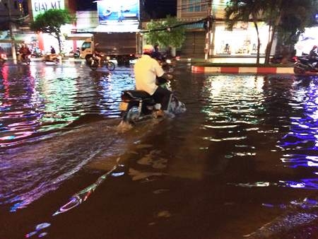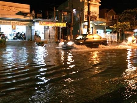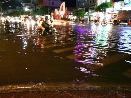 Tuyến đường chính trong nội ô TP Bạc Liêu, đường Trần Phú "biến" thành sông sau cơn mưa lớn kéo dài nhiều giờ. |
