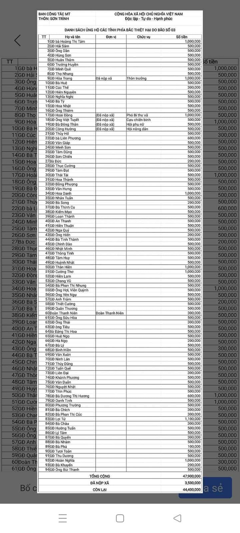 Danh sách ủng hộ cho thấy, hầu hết các hộ dân ở thôn Sơn Trình đều ủng hộ từ 500 nghìn đồng trở lên, trong đó, một số người ủng hộ 1 triệu đồng.