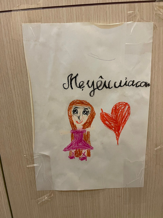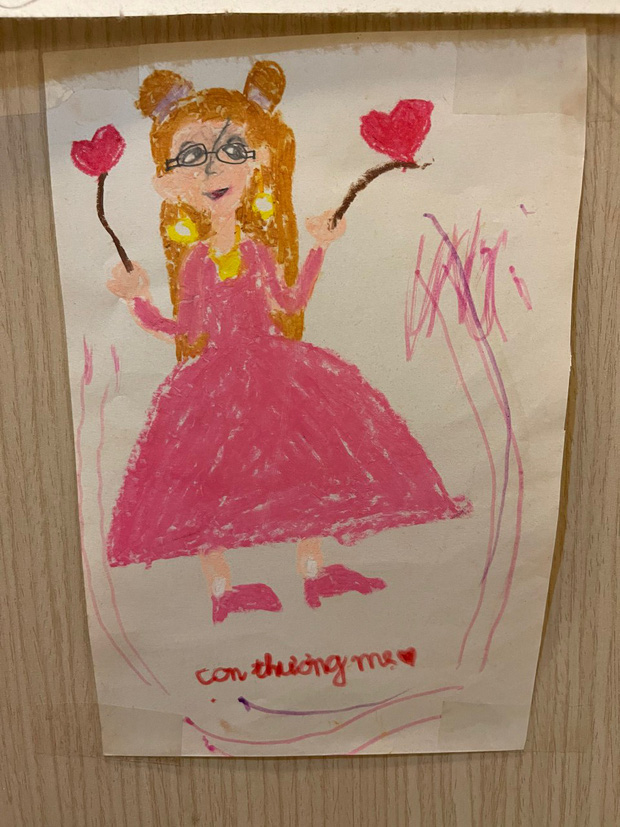 Đặc biệt, thông qua những dòng chữ, những lời nhắn "con yêu mẹ rất nhiều", "con thương mẹ", "mẹ yêu của con" liên tục được lặp lại trong bức tranh, có thể thấy được tình cảm, sự nhớ nhung của bé V.A. dành cho mẹ lớn đến nhường nào.