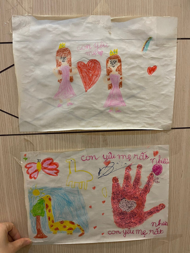 Mới đây, trên mạng xã hội bất ngờ chia sẻ những bức tranh sáp màu được cho là của bé V.A. vẽ cho mẹ mình.