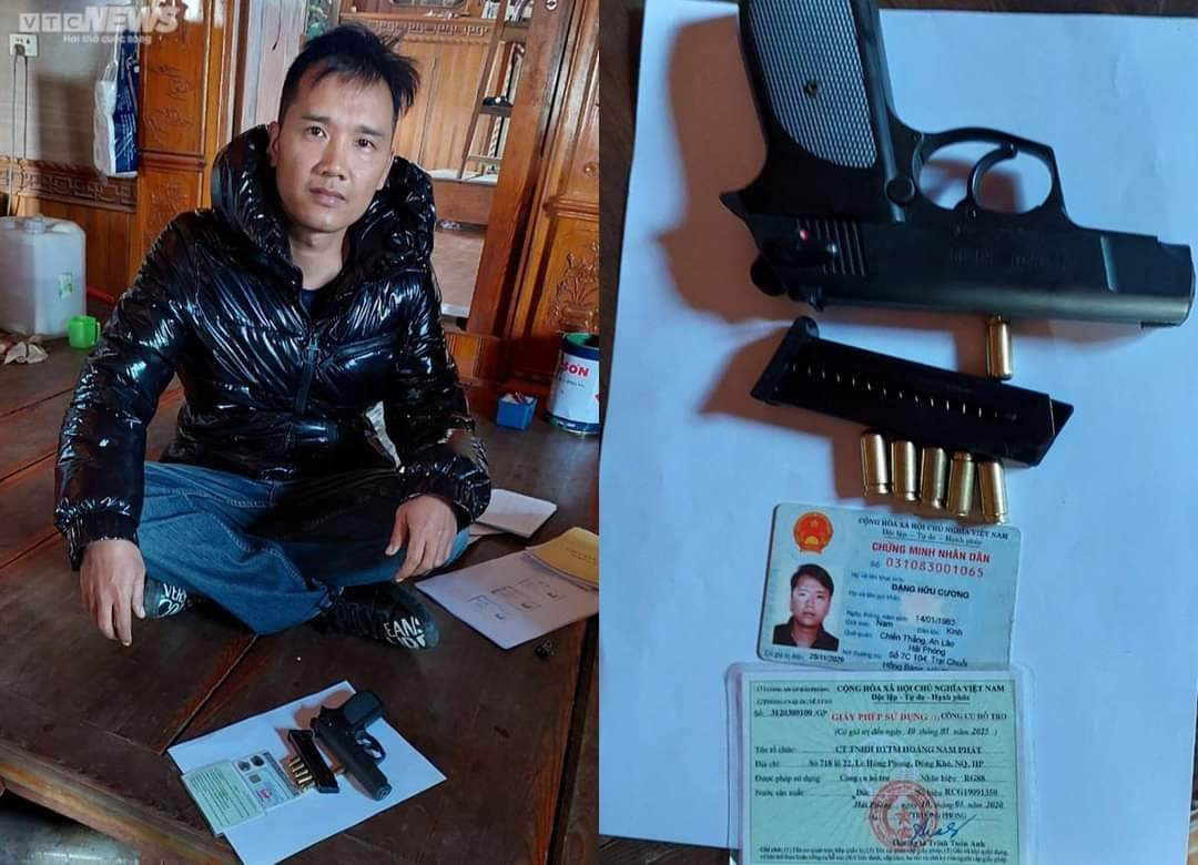 Ông Cường mang theo 1 khẩu súng mang nhãn hiệu RG88, số hiệu RCG19091350 (giấy phép sử dụng công cụ hỗ trợ số: 3120300100/GP do Phòng Cảnh sát quản lý hành chính về TTXH- Công an thành phố Hải Phòng cấp ngày 10/03/2020) cùng 5 viên đạn và 1 vỏ đạn đang nằm trong nòng súng.