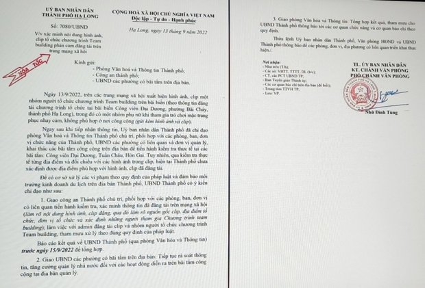 Để có cơ sở xử lý các vi phạm theo quy định của pháp luật và đảm bảo môi trường kinh doanh du lịch trên địa bàn, UBND thành phố Hạ Long chỉ đạo Công an thành phố chủ trì, phối hợp các phòng, ban, đơn vị có liên quan tiến hành kiểm tra, xác minh thông tin đã đăng tải trên mạng xã hội; làm việc với admin đăng tải clip và nhóm người tổ chức chương trình Team building, tham mưu xử lý theo đúng quy định của pháp luật và báo cáo kết quả về thành phố trước ngày 15/9.