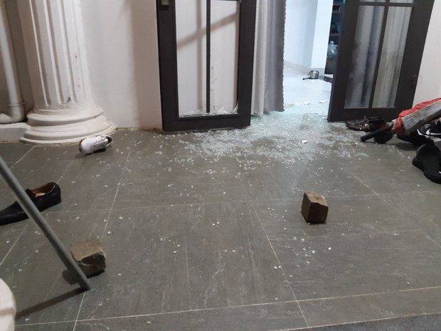Theo ghi nhận, tại hiên biệt thự và phòng khách, nhiều tấm kính, bàn ghế và các vật dụng khác bị vỡ, vương vãi khắp nơi.