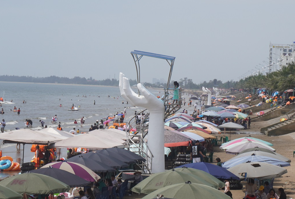 Thực tế tại bãi tắm này vào ngày 2-5, trong số 5 bàn tay "khổng lồ" dọc bờ biển đã có 3 công trình được hoàn thành, còn 2 công trình đang xây dựng dở dang. Điều đáng nói là việc bày bán hàng dưới bãi biển quanh các công trình này tràn lan, cộng với chân đế của những bàn tay đã chiếm hết không gian bãi tắm.
