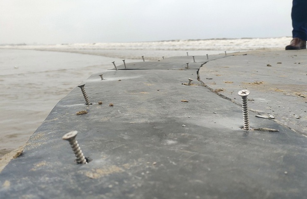 Nguy hiểm hơn, do được làm vội vàng để kịp cho kỳ nghỉ lễ 30-4 và 1-5 nên những chân đế bê-tông được phủ bạt nhựa, đóng đinh vít để gia cố đã bị bong ra, rất nhiều đinh vít bằng kim loại lòi hẳn ra ngoài, tiềm ẩn nguy cơ gây thương tích cho du khách vui chơi, tắm biển.