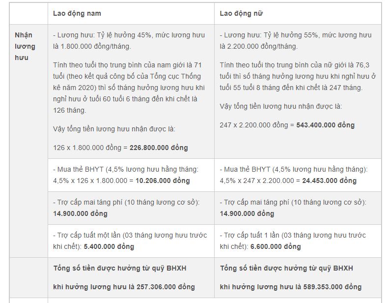 Ví dụ: Một người lao động có đủ 20 năm đóng BHXH (từ năm 2001-2020), với mức bình quân tiền lương làm căn cứ đóng BHXH là 4.000.000 đồng/tháng. Giả định người lao động đủ điều kiện hưởng lương hưu hoặc hưởng BHXH một lần trong năm 2022, lương hưu hưởng đến khi chết, không tính đến tác động của các yếu tố tỷ lệ lạm phát, tốc độ tăng tiền lương, tỷ lệ điều chỉnh lương hưu, lãi suất đầu tư quỹ BHXH, thì người lao động sẽ nhận được số tiền như sau: