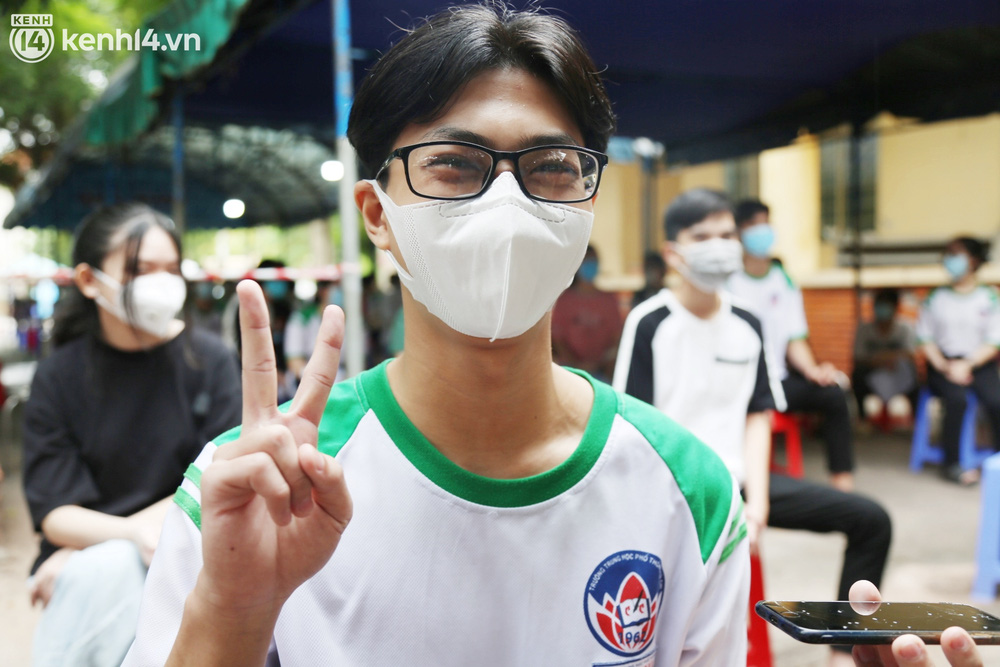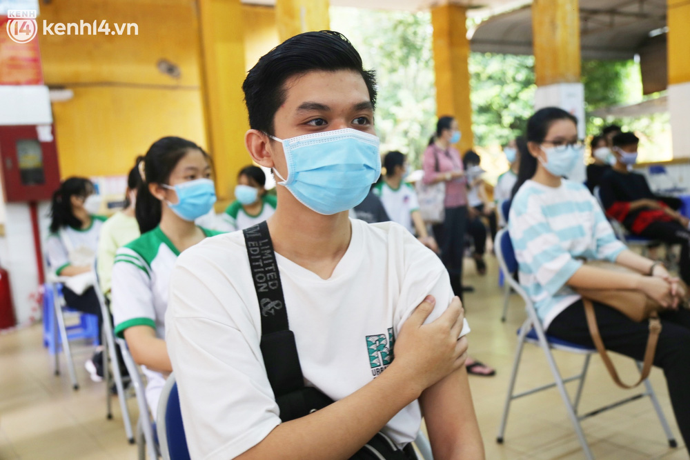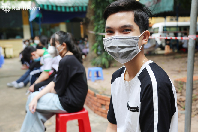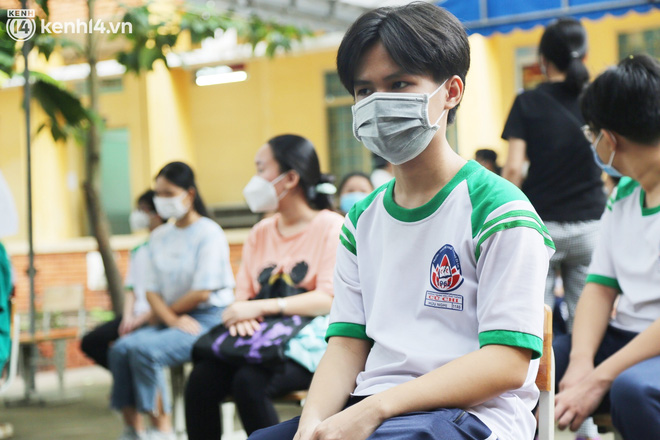 Ngồi kế bên Phước, Thân Trọng Bảo (17 tuổi) cũng cho biết bản thân em hơi lo lắng vì sợ sẽ gặp phải các triệu chứng sau tiêm. Tuy nhiên, nhìn thấy các bạn đều tự tin, vui vẻ nên bản thân em cũng đỡ áp lực hơn.