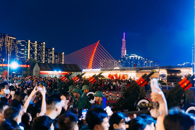 Theo ghi nhận của chúng tôi, khoảng 19h30 tối 17/4, hàng trăm người dân TP.HCM đã tập trung tại Công viên Bến Bạch Đằng để chứng kiến màn diễn tập bắn 21 phát đại bác do Lữ đoàn 96 (Binh chủng Pháo binh) thực hiện.