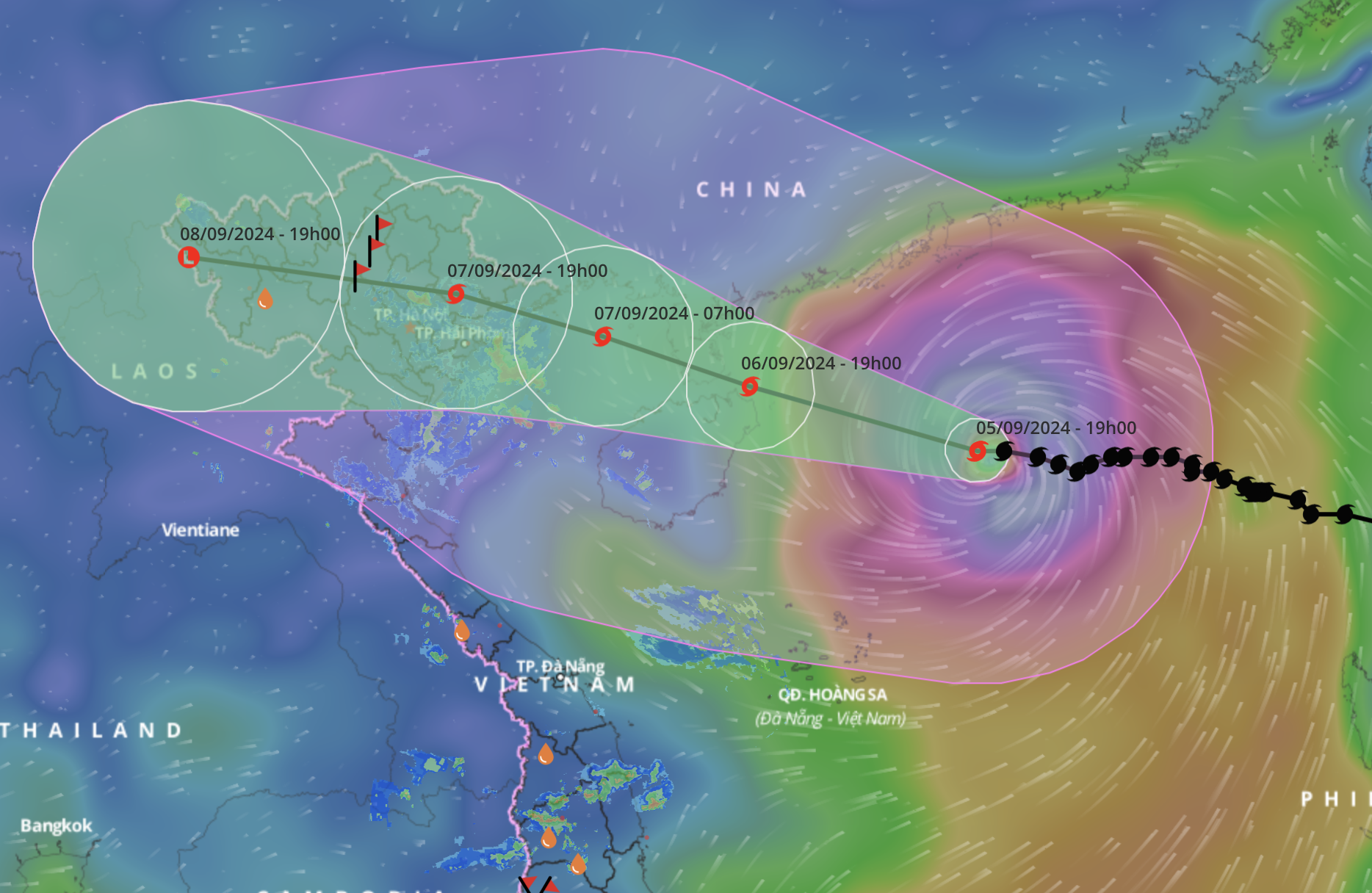 Hồi 19h tối 5/9, siêu bão Yagi cách đảo Hải Nam (Trung Quốc) khoảng 365km về phía đông. Cường độ bão vẫn đang mạnh cấp 16 (184-201km/h), giật trên cấp 17.