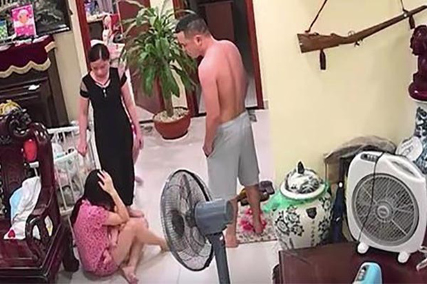 Khi người vợ bế con nhỏ định tiến vào bên trong nhà thì anh L bất ngờ vung tay tung cái tát trời giáng lên mặt vợ... Lúc này, một cậu con trai nhỏ ngồi ở ghế xem ti vi cũng chỉ im lặng quay lại chứng kiến bố đánh mẹ.