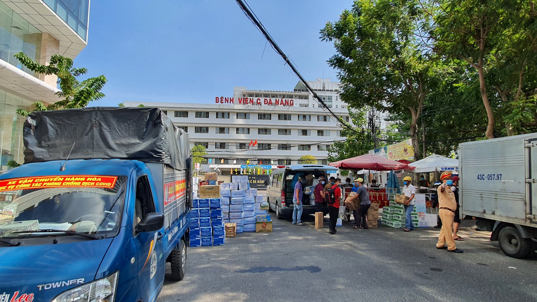 Còn tại trước khu vực cách ly bệnh viện C, hàng loạt chuyến xe tải cứ nối đuôi nhau chở hàng đến. Đây là điểm nhận hàng ủng hộ đối với cụm 3 bệnh viện: Đa khoa Đà Nẵng, Chấn thương Chỉnh hình Đà Nẵng và bệnh viện C.