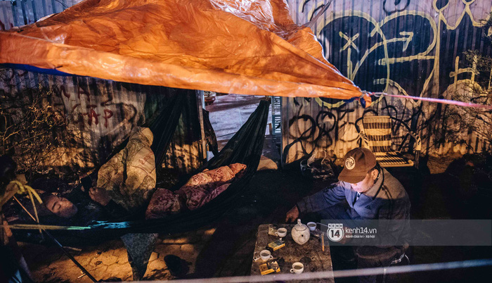 Nhóm anh có 2 người, thay phiên nhau canh đào đêm trên phố Lạc Long Quân. Hỏi anh trời lạnh thế này có chịu nổi không, cái túp lều kia chẳng có gì ngoài tấm bạt lớn, yếu ớt và xiêu vẹo.