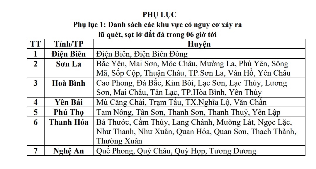 Trong 6 giờ tới, nguy cơ xảy ra lũ quét trên các sông, suối nhỏ, sạt lở đất trên sườn dốc tại nhiều các huyện sau: