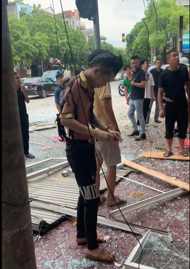 Toàn bộ cửa kính tầng một của quán bị thổi bay và vỡ vụn, bắn xa hàng chục mét, khiến ít nhất 1 người dân đi trên đường bị thương.