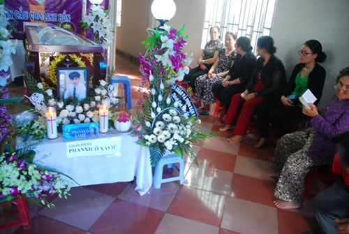 Lễ tang của Quang được kết trắng hoa huệ. Phía sau những hàng hoa trắng tinh khôi, bức hình kỷ niệm chụp lúc Quang còn sống được sử dụng để làm di ảnh.
