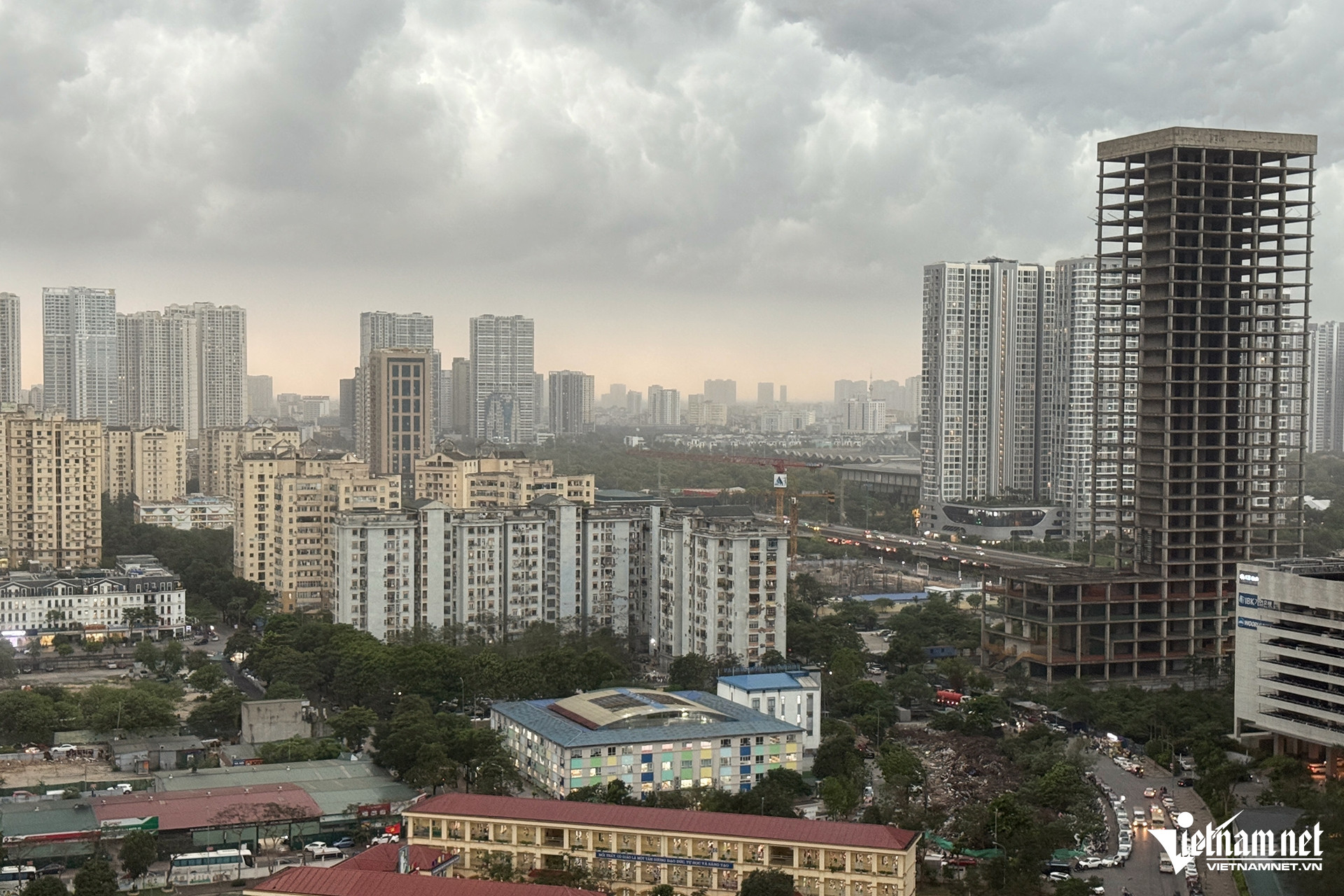 Mây dông phát triển mạnh trên khu vực Hà Nội, khiến bầu trời thành phố tối sầm lúc 15h ngày 21/4.