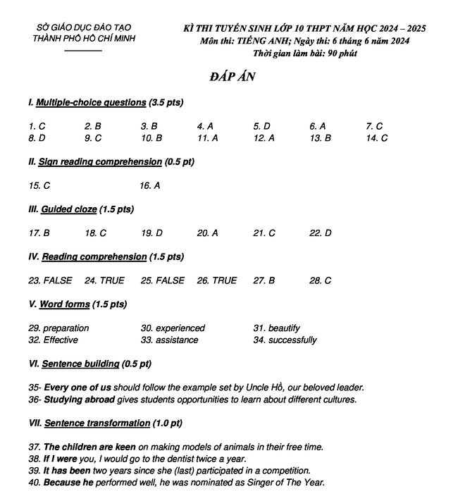 Cụ thể đáp án đề thi vào lớp 10 TPHCM năm 2024 như sau: