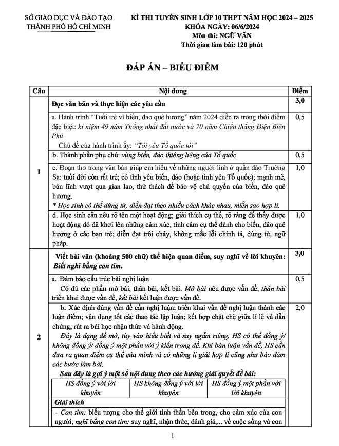 Mới đây, Sở Giáo dục và Đào tạo TPHCM đã chính thức công bố đáp án, thang điểm chấm thi 3 môn Ngữ văn, Toán, tiếng Anh trong kỳ thi lớp 10 năm học 2024-2025.