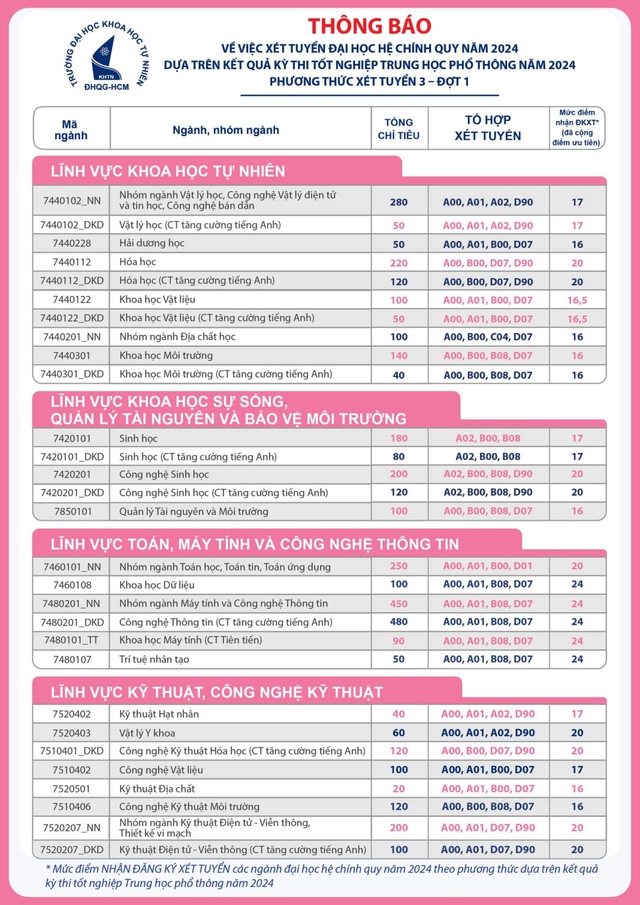 Trường Đại học Khoa học Tự nhiên, Đại học Quốc gia TP HCM, chiều 17/7 thông báo điểm sàn (ngưỡng điểm nhận hồ sơ xét tuyển) năm 2024. Các ngành "hot" thuộc lĩnh vực Máy tính và Công nghệ thông tin lấy điểm sàn từ 24 điểm trở lên.