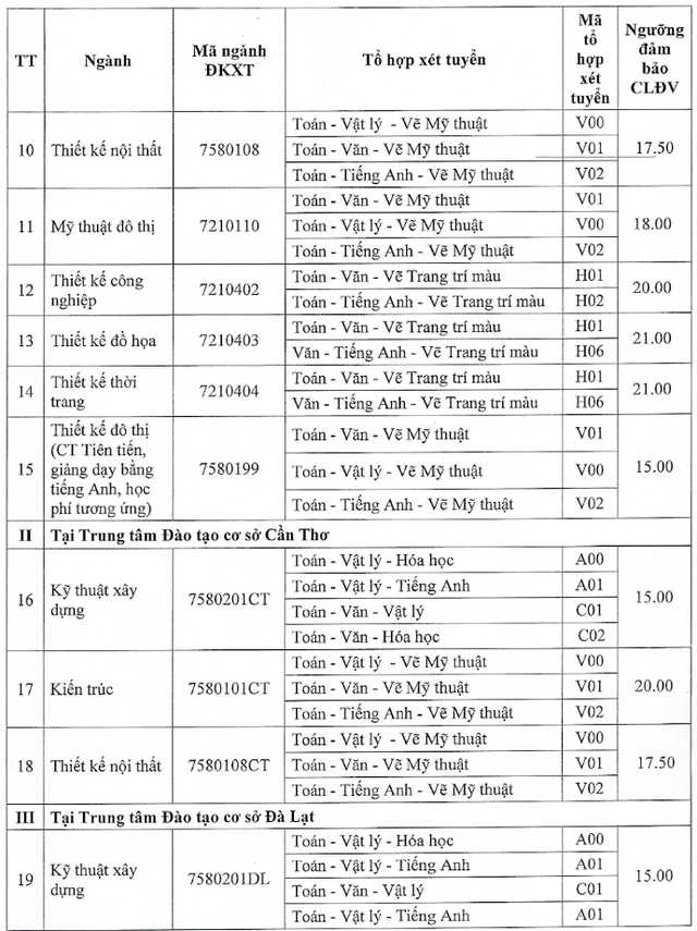 Theo đó, mức điểm sàn của Trường Đại học Kiến trúc Hồ Chí Minh dao động từ 15 - 21 điểm. Trong đó ngành có điểm sàn cao nhất là ngành Kiến trúc (chương trình chất lượng cao); Thiết kế đồ họa; Thiết kế thời trang.
