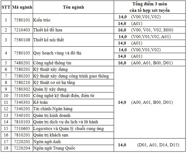Theo đó, mức điểm sàn đại học cho các ngành đào tạo hệ chính quy tại Trường Đại học Kiến trúc Đà Nẵng là từ 14 điểm, chi tiết như sau: