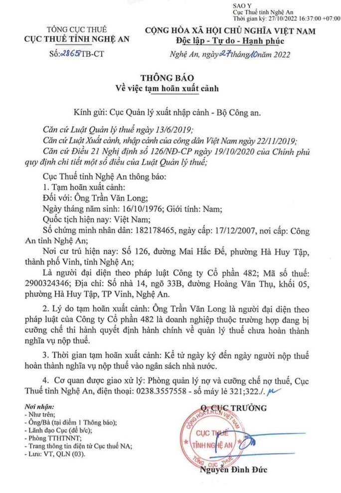 Ngày 27-10, Cục Thuế Nghệ An có thông báo về việc tạm hoãn xuất cảnh đối với ông Trần Văn Long (SN 1976, trú TP Vinh, Nghệ An). Ông Long là người đại diện pháp luật Công ty Cổ phần 482, ông Long bị tạm hoãn xuất cảnh do Công ty Cổ phần 482 thuộc trường hợp đang bị cưỡng chế thi hành quyết định hành chính về quản lý thuế chưa hoàn thành nghĩa vụ nộp thuế. Thời gian bị tạm hoãn xuất cảnh từ ngày 27-10-2022 đến khi hoàn thành nghĩa vụ nộp thuế vào ngân sách nhà nước.