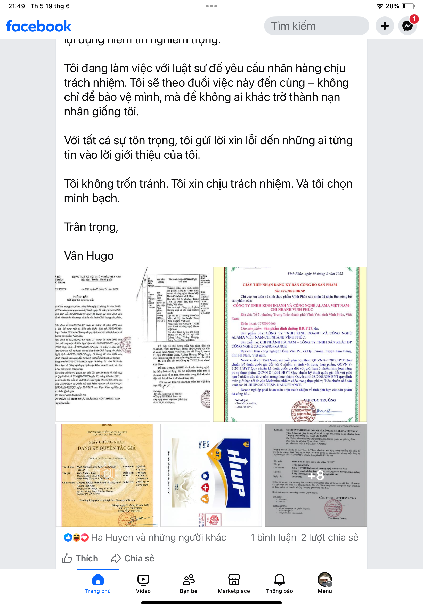 Cách đây ít phút, trên trang cá nhân Facebook của mình, MC Vân Hugo đã chia sẻ về những lùm xùm xoay quanh vụ việc quảng cáo sai sự thật cho sữa giả HIUP.