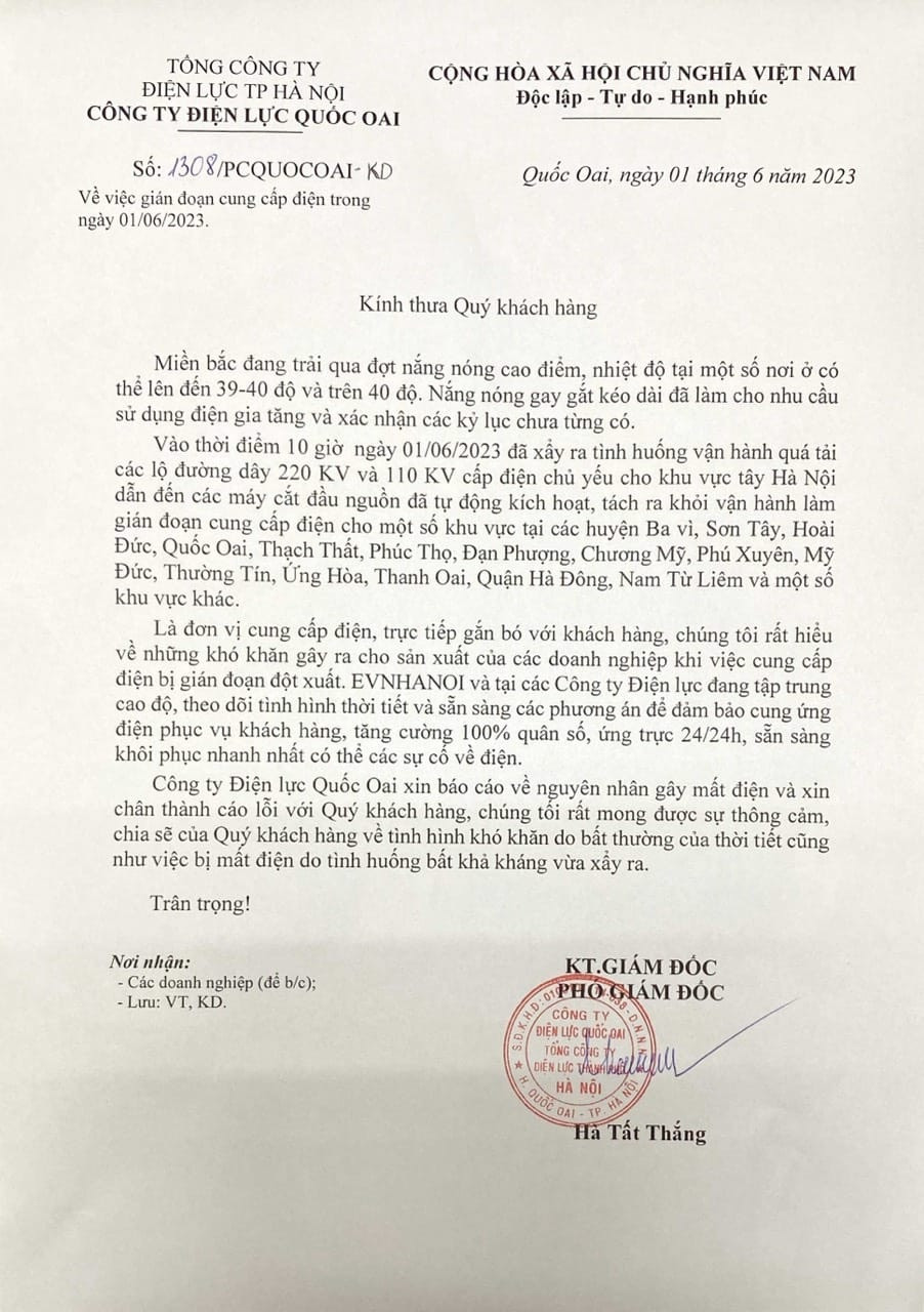 Trong văn bản phát đi hôm qua, công ty Điện lực Quốc Oai cho biết: "Vào thời điểm 10h ngày 1/6 xảy ra tình huống vận hành quá tải các lộ đường dây 220KV và 110KV cấp điện chủ yếu cho khu vực tây Hà Nội, dẫn đến các máy cắt đầu nguồn tự động kích hoạt, tách ra khỏi vận hành làm gián đoạn cung cấp cho một số khu vực tại các huyện Ba Vì, Sơn Tây, Hoài Đức, Quốc Oai, Thạch Thất, Phúc Thọ, Đan Phượng, Chương Mỹ, Phú Xuyên, Mỹ Đức, Thường Tín, Ứng Hòa, Thanh Oai, quận Hà Đông, Nam Từ Liêm và một số khu vực khác".
