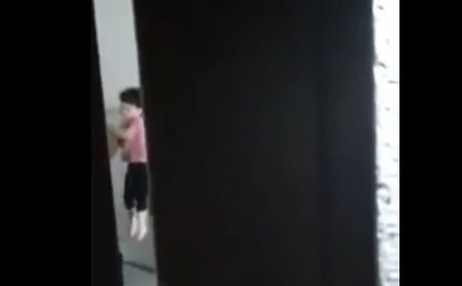 Khi bé té xuống nền nhà, thì người đàn ông quát "đứng dậy". Người đàn ông còn dùng một tay nắm vào vùng cổ bé nhấc bổng lên ghì đầu bé vào tường. Cháu bé còn bị người đàn ông đánh ngửa ra sau, đập đầu vào tường.