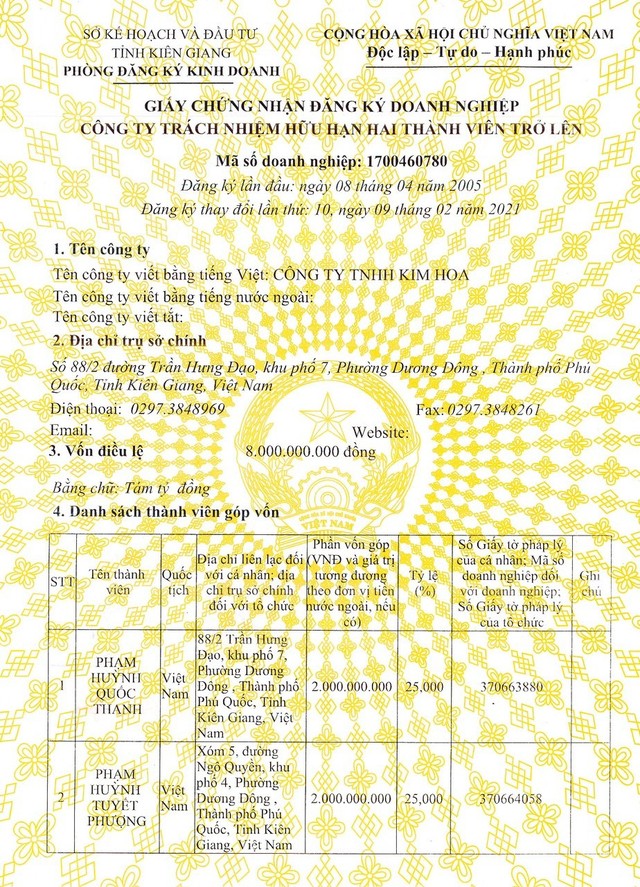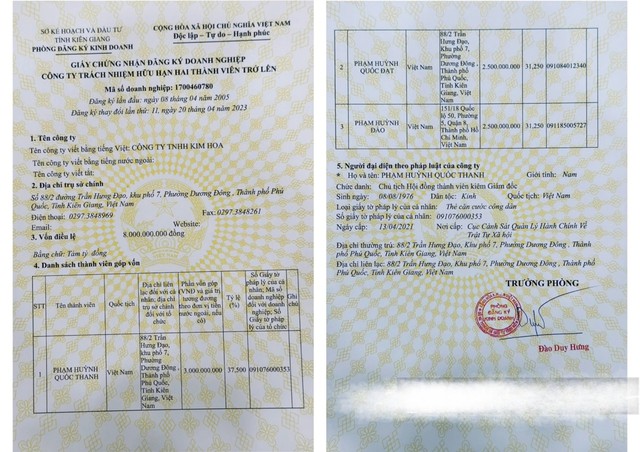 Trong khi đó, giấy chứng nhận đăng ký kinh doanh của khách sạn Kim Hoa đăng ký thay đổi lần thứ 10, ngày 9-2-2021 thì có 4 thành viên góp vốn như nhau. Ông Thanh sở hữu 25%, bà Phượng sở hữu 25%...